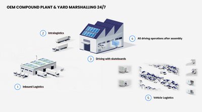Die Unikie Marshalling Solution (UMS, Bild) automatisiert das Fahren in nicht öffentlichen Bereichen sowie Betriebsabläufe von einzelnen automatisiert fahrenden Fahrzeugen bis zu Flotten.