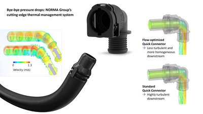 Mithilfe fortschrittlicher Simulationstechniken werden strömungsoptimierte Thermomanagementsysteme entwickelt. Dank der Optimierung der Geometrie und des Durchmessers der Komponenten lassen sich der Druckabfall minimieren und die Systemeffizienz steigern. Beispielsweise verwendet das Unternehmen flexible, glatte Rohre, die im Vergleich zu Wellrohren einen deutlich geringeren Druckabfall verursachen, sowie einzigartige, strömungsoptimierte Steckverbinder. Durch die Integration von Sensoren können Anwender den Druck sogar in Echtzeit überwachen. Wer sich für das innovative Thermomanagementsystem von NORMA Group (Bild) entscheidet, kann den Druckabfall effektiv reduzieren.